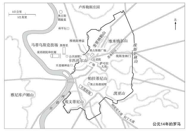 公元14年夏,他死在诺拉。一个世纪前,苏拉就是从这里出发向罗马进军的。为防止尸体腐烂,元老们连夜将其护送到了首都。在马修斯大校场的大堆木材上,像苏拉那样,人们把奥古斯都火葬了。如果老独裁官天上有灵,他会发现此后的做法与他知道的大有不同。人们恭敬地将恺撒·奥古斯都的骨灰收集起来,安放在他的陵墓中。陵墓占地极广,单独建在一个园子里。据说,在规模及其环绕形式的设计上,人们从亚历山大大帝的陵墓受到很多启发。以前,马修斯大校场是罗马年轻人的训练场,如今,它成了展示元首美德的地方。陵墓南方是庞培的剧院。以恢弘的气度,恺撒的儿子将恺撒大敌的名字和战利品保留了下来。为表现他的宽和,在原来共和国公民练习使用武器和集结做战争准备的地方,一座和平祭坛竖立起来。为昭显他的慷慨善行,公元前26年,一条一英里的美丽柱廊完工了,长度超过庞培的大剧院。在那里,奥古斯都展览这个城市从未见过的壮观景象,很快成了罗马人的主要娱乐场所。它的正式用途是作为投票处的奥维里(Ovile),在原来的木质围栏上夸张地用大理石接续起来。实际上,它很少用于投票。在从前罗马人选举行政官员的地方,角斗士们相互搏杀,像长达90英尺的大蟒蛇那样的稀奇动物在公开展示。没有安排表演节目的日子里,公民们聚集在这里进行豪华购物。