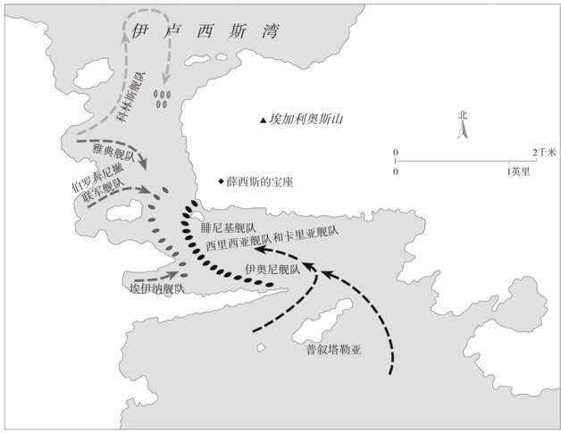 至少可以肯定一点,他最想看到的是希腊舰队在伏击中崩溃,船杆随波飘浮,尸体堆满普叙塔勒亚岛上的岩石。但是他在来到萨拉米斯之前就得到通知,预计伯罗奔尼撒人逃离战场的事情并没有发生,而且更令他感到失望的是希腊舰队在脚下狭窄海峡中列队的场面。而黎明时分他自己的舰队究竟在何处?这个问题非常关键:联军舰队的战略依据是在狭窄海峡中开战,而国王的海军得到命令却是在开阔海域迎击希腊人。这个僵局已经持续了三星期。而认为对手完全是乌合之众的念头再也没有鼓动帝国海军的司令官们冒险攻入海峡。这个决定之重大超乎历史上很多次战争;因为它决定的不仅是一次战役的胜败,也不仅是这次战争的胜败,而是关系到欧洲和西方文明本身的存亡。令人生气的是——我们完全不知道这个决定在何时、为何下达——只知道当战斗最后打响的时候,的确发生在波斯人最不希望的地点:恰好是萨拉米斯海峡之中。