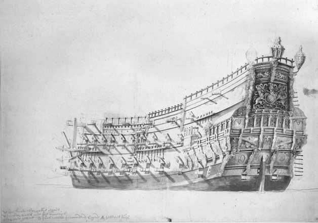 “坚决革新”号(ConstantReformation),詹姆斯一世时期的巨轮,后来被加建了两层,又装载了更多的火炮。此图由老凡·德·威尔德所绘。这艘船在1648年保王派的起义后被带到了尼德兰。(国家海事博物馆,PZ7253)