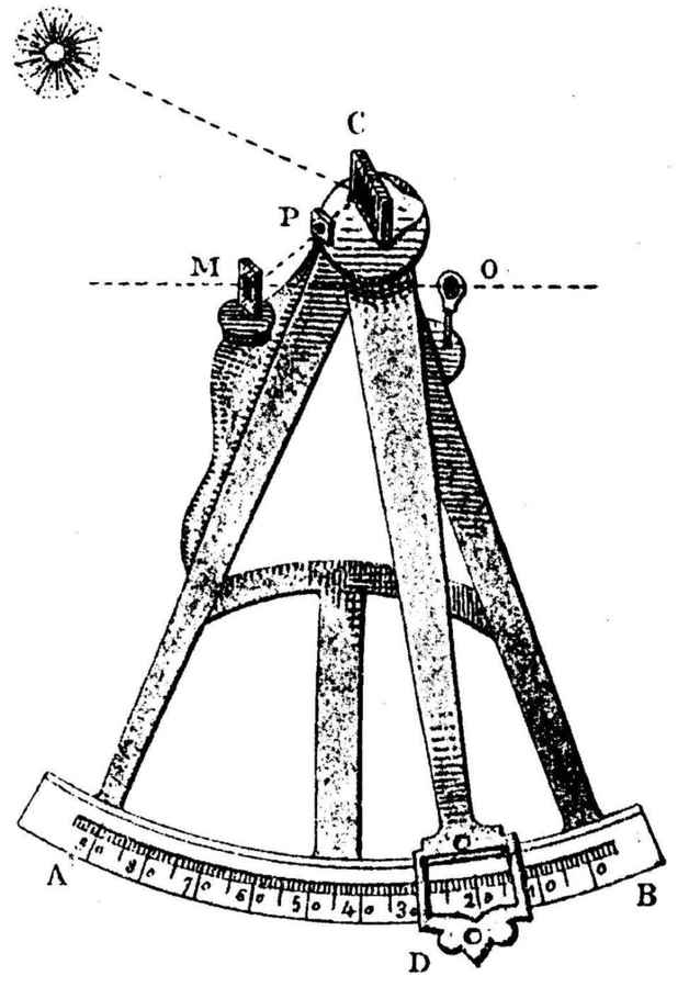 古代的直角仪结构简单,仅用一块木片沿着标杆移动,然后标上刻度。航海家把标杆对着水天线做基准,移动木片至标杆顶端,与恒星或其他行星重合成一线,在刻度弧上直接读出观测数据。象限仪是一个铜质弧面,顶端垂着一根测量线。操作者将象限仪一端指向恒星,透过小孔观察,在线落到刻度盘的位置标记上刻度。然而,海员们直视太阳一般不会长于两秒,由此人们发明了日晷。这是一种铜质圆盘,上面标有刻度,“晷针”垂直地穿过圆盘中心,起着立竿的作用。在旋轴上有两个小孔,小孔对准太阳,影子则会投射在铜制刻度盘上,形成角度,然后便可读出刻度。观测者也可利用竿式投影仪(backstaff)或英式象限仪(Englishquadrant)测量角度,他们需背朝太阳,并利用投射在仪器上的影子计量角度。
