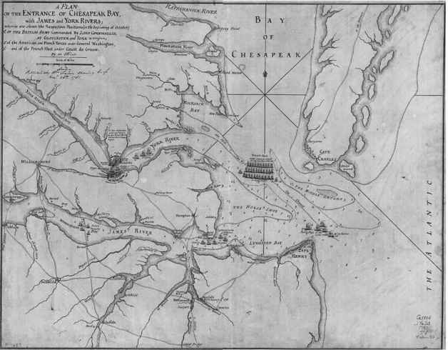 攻占约克镇,上页图显示由于法军舰队封锁了约克河的入口,英军在约克河南岸的位置,以及海航的困难。切萨皮克湾战役(BattleofChesapeakeBay)就在这河口处打响,但是战争中托马斯·格雷夫斯(ThomasGraves)没能成功地驱逐法军。(美国国会图书馆)