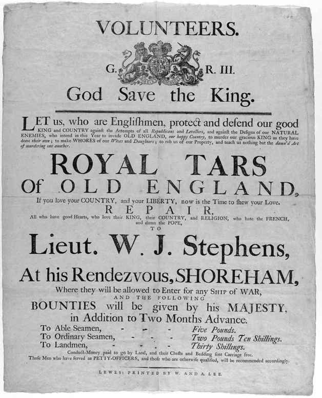 在1797年海军海员短缺危机时期,苏萨克斯郡的招募广告。“rendezvous”(集结地)是当地的募军部,可能就是在小旅馆里租的一间屋子。(国家海事博物馆,F3642)