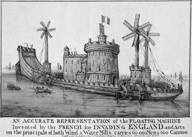 吉尔雷所画的漂浮器,船上有风车、城堡,船侧有轮桨,这幅画是对法军进攻英国所用战舰的大胆猜测,精彩而又可怕。这是当时各种奇思妙想之一,除此以外,还有很多诸如火箭、潜水艇、用气球运载的航空炸弹等。(国家海事博物馆,A5505)