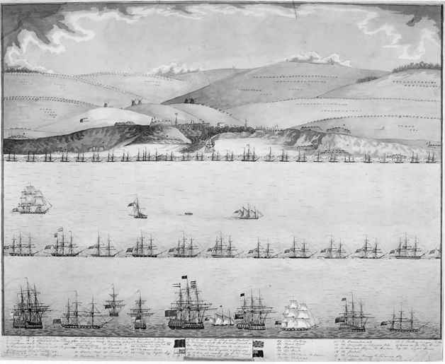 封锁布洛涅。一列小型法军战列舰排列在岸边沙丘的不远处,而图片下方在海峡中央的是英军的单桅帆船、双桅帆船,以及包括两艘双甲板船在内的大型战舰。(国家海事博物馆,PZ6989)