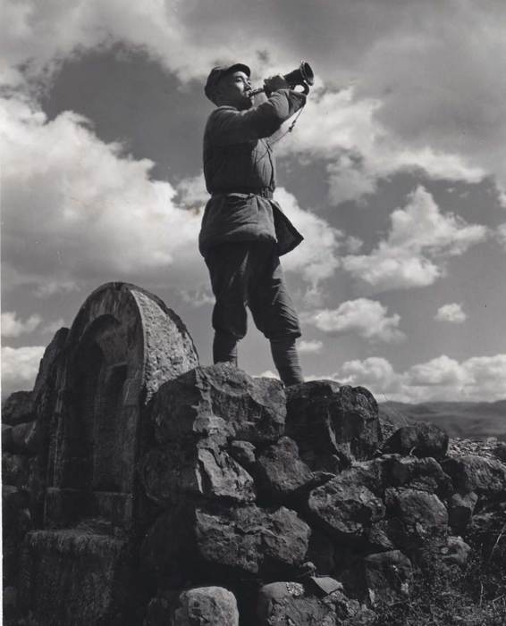 Standing on the top of an ancient tomb, a Chinese bugler sounds reveille to awake his comrades training at an Army Camp in Southwest China.
