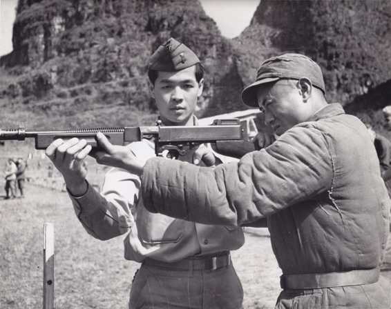 在腾冲的53军空投场地布置的识别板中,美军联络官小组指挥官约翰·斯多德上校检查烟幕信号的操作情况,通过翻译官马先生(别名:乔尼·弗里曼)在向中国士兵讲解烟幕弹的释放。