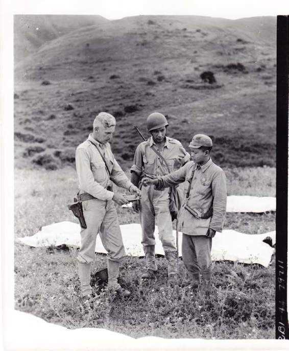 来自夏威夷檀香山的安德鲁·卢中尉教一名中国士兵握举汤姆逊冲锋枪的正确姿势。