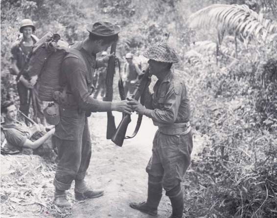 Cpl.Bernard Martin,of R.I.,5307th Composite Unit and aChinese soldier inspect each other's rifle,near Nhpum(Ga),Burma.