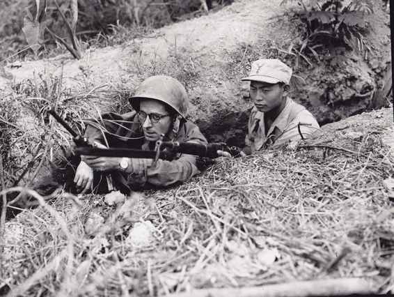 中缅印战区综合报道记者埃德加·雷萨参谋军士和他的中国朋友在战壕里。