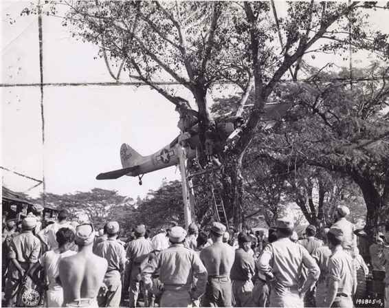 士兵们齐心协力将一名驾驶联络飞机坠毁在树杈上的受伤飞行员安全救出。他的三名乘客是玛尔斯特遣队的负伤步兵,当时正由与日军作战的丛林战场转运后方。