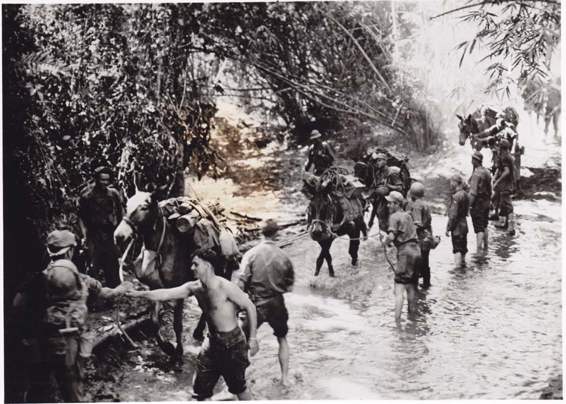 美军“玛尔斯特遣队”的部队牵着驮畜穿过缅甸的丛林溪流,与盟军的抗日大部队会合。这支由炮兵与步兵组成的作战力量,包括原“梅瑞尔突击队”队员,从密支那向南一路挺进,穿过丛林,计划在1944年12月中旬到达曼德勒120英里范围之内。