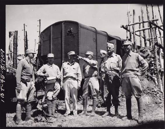 新38师团指挥官陈上校、印缅战区总指挥丹·索尔登准将、孙(立人)将军、查尔斯·埃伦中校,以及列维勒上校一行察看在腊戌-曼德勒铁路的旧火车车厢。(译者注:背面未注明,左二李鸿、右一唐守治)。