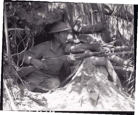 This Chinese guard of the4th Company,2nd Battalion of the64th Regiment,22nd Division,is on the alert for Jap patrols.This position is about300yards from the front under mortar fire.