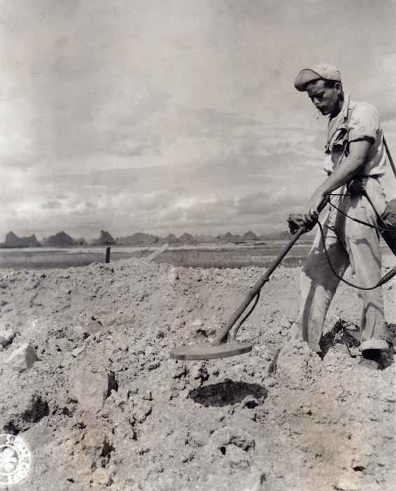 The most dangerous job of clearing the Liuchow, China airstrip of mines falls to Pvt. Earl Lynch, 200 Pine St., Wichita, Falls Texas, who has to walk over a lot of loose ground and rocks,all of which is heavily mined by the retreating Japanese. The 1891st Engineer Aviation Bn., has a two man team clearing the airfield. Pvt. Lynch uses a regular Signal Corps Mine Detector.