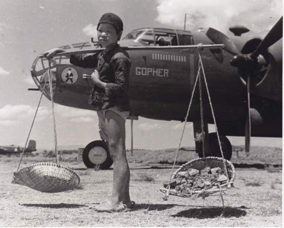 Chinese boy with his load of crushed stone and dirt pauses in front of an American B-25on an airfield"somewhere in China".