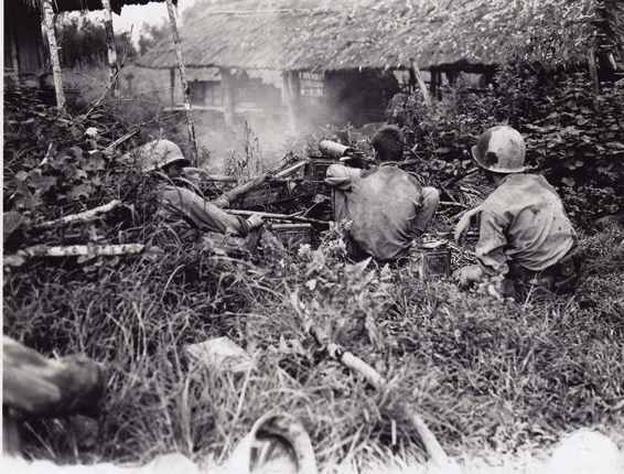 Heavy30cal.machine gun firing at Japs about100yards away.These houses are part of the village of Sitapur on theoutskirts of Myitkyina,Burma.