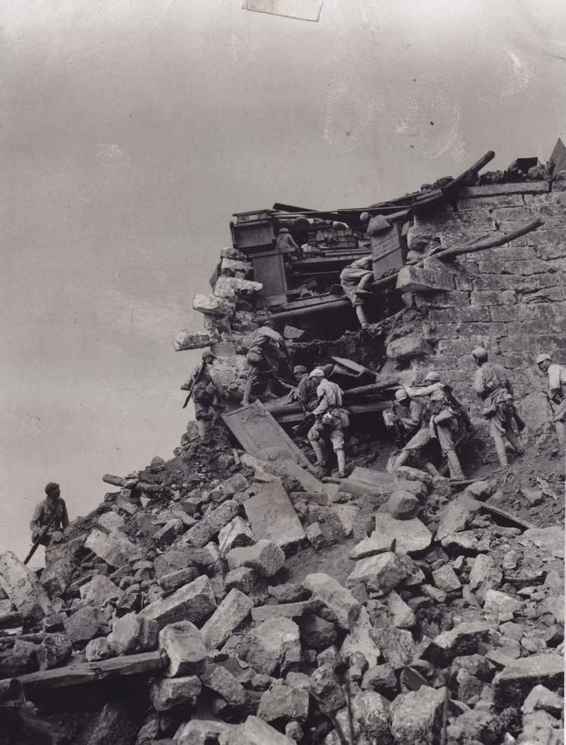 盟军解放了缅甸以东的第一座中国城市。经过5周的血战,古老的玉石故乡腾冲终于摆脱了日本的统治。图中,中国士兵正在攀爬损毁了的城墙,远处的硝烟是盟军投掷的手榴弹所致。(请另参照ACME 照片#738968-969-970-971)