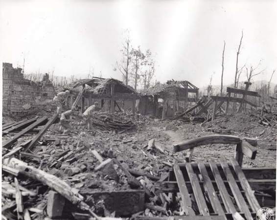 Chinese soldiers advance through ruined streets of the ancient walled city of Tengchung,which had been held by Japanese invaders for two years.The Chinese aided by the Y-Force Operations Staff,virtually exterminated the2,000Jap defenders in taking the city,one of the main objectives of the Salween River campaign.