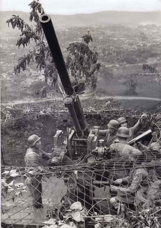 中国的首都重庆郊外一座山岭上,装备了一门高射炮。白天日军轰炸机肆虐了中国多个城市。今天他们没敢来挑战。高射炮战略性地部署在重庆市四周。这个城市在过去三年夏天中遭受到的轰炸比世界上任何城市都要猛烈。当五月到来,新一轮轰炸又要开始,这些严格训练的防空部队地勤人员整装待发准备应对来自空中的袭击。高射炮设置在一个环形小坑内,由树叶和树枝掩护好以防被敌机发现。