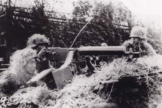 Chinese soldiers with amodern machine-gun.Well camouflaged against detection.Photographed in action on one of the many fronts.