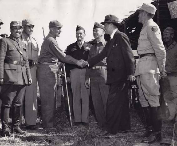 Dr. T. V. Soong greets the convoy commander Brig. Gen. Lewis A. Pick as the convoy reaches the Burma-China border.