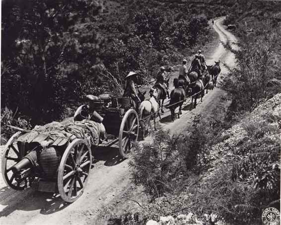 A ten-mule team draws heavy Chinese Howitzer over mountainous Burma Road on its way to the fighting at Lungling,Yunnan,China.The Chinese are now consolidating their position in Lungling which was recaptured early in November.
