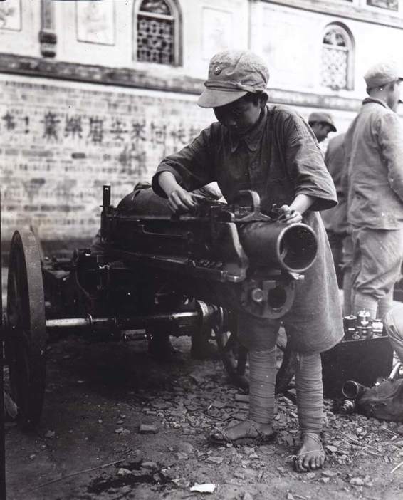 中国陆军74军的一位年轻士兵在部队开赴芷江前线前擦拭75毫米榴弹炮。