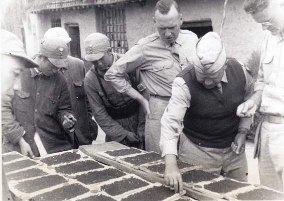 大卫·包瑞德上校和观察组其他成员参观地处陕西省的一个小型军火库。照片中他们正在检查地雷的引线药。军火库中80%的武器和弹药都是缴获的日军装备。