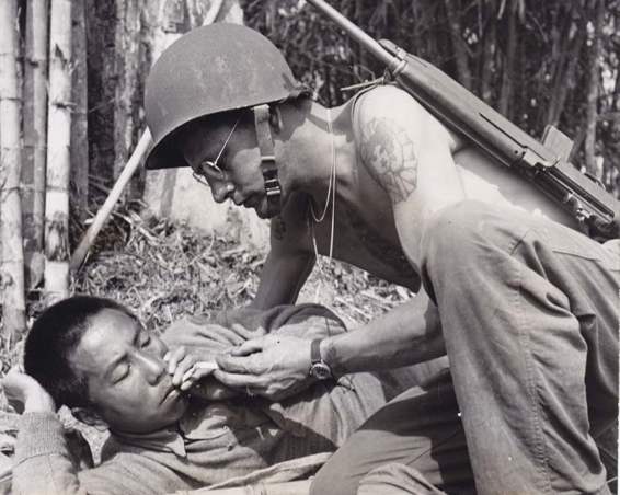 A U.S.soldier bends down to light acigarette for awounded Chinese comrade during the fighting in the Hukawng Valley in Northern Burma.American and Chinese forces advancing in atwo-pronged thrust drove the Japanese from the strategic valley.