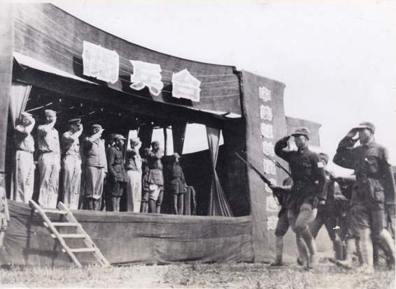 Chief of Staff, General Yeh Chien-ying, Brigade Commander General Wang Chen, Colonel David D. Barrett and members of the Section, return the salute as the 359th Brigade passes the reviewing stand. The Chinese characters over their heads denote, "Reviewing Platform". The line of characters to the right says, "China, United States, Soviet Union, Great Britain,Unite".