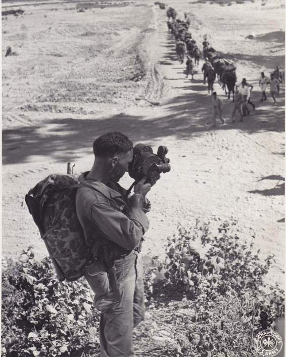 来自纽约的164照相兵连摄影师杰克逊·波克李斯五级技术军士正在拍摄475步兵团第三营的士兵和骡马队行军至密支那渡河点附近的照片。