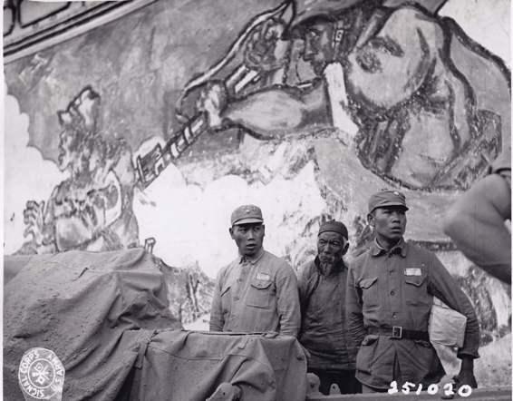 在中国下关(现云南省大理州大理市),好奇的中国士兵们和一个年长的老人对史迪威公路上沾满泥泞的榴弹炮充满兴趣。后面的宣传画中的是中国抗击日本的场景。