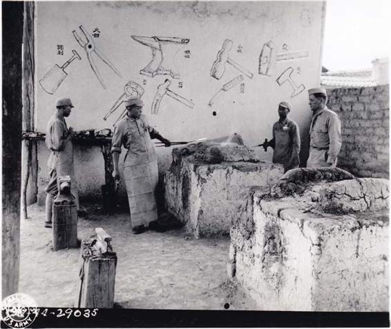 T/5Wallace F.Carp,Wichita,Kansas,looks on while Chinese students do blacksmithing in52nd Army School Hq.Yenshan,Yunnan,China.