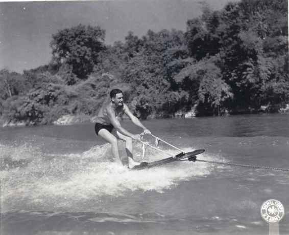 唐纳德·鲍文二等兵正在太平河上“冲浪”,滑水穿过缅甸丛林。冲浪板由209工兵营A连的一群聪明的工兵们用一间缅甸房屋拆下的木板打造而成。