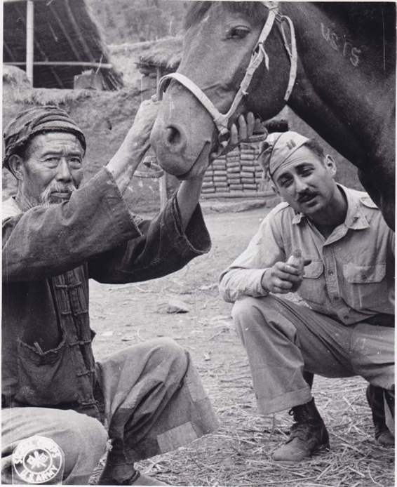 28师的来自新泽西州伊丽莎白的兽医米尔顿·胡洛威兹上尉正在为一批从中国大坝运来的准备送往前线的马匹做检查。图中还有一个中国平民和他在一起。
