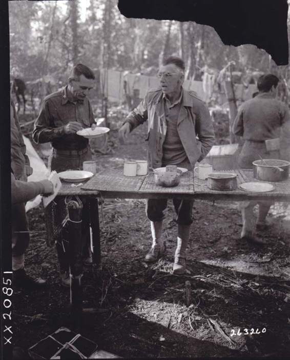 Major George V.Campbell,Pasadena,Calif.and Lt.General Joseph W.Stilwell are eating breakfast from acrude table set in the open in Northern Burma.