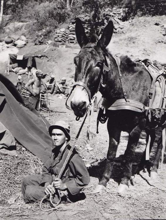Pfc. James L. Miller,Woodbine Station Route #4,CaklandAve.,Nashville,Tenn. a mule packer of L CO.,of the 3rdBattalion,475th Regiment and his mule are resting beforeclimbing a steep mountain,Burma.