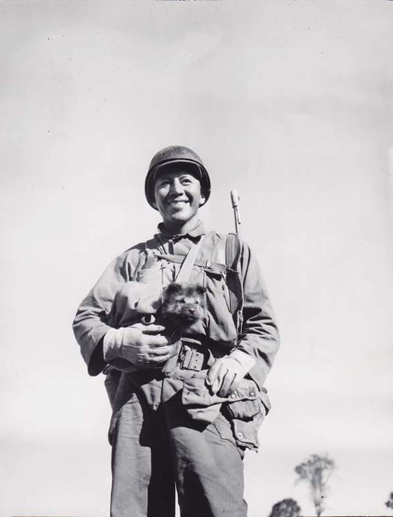 来自德州沃斯堡的比亚·阿尔克兹参谋军士抱着狗徒步到滇缅公路附近的阵地。他隶属于玛尔斯特遣队。