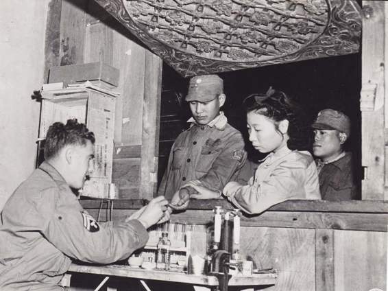 在怒江前线,美军医疗部队负责将因疟疾而引起的非战斗减员降至最低点。图中所示,在前线某地的医疗站,美军技师和一名中国护士正从一名中国士兵手上接过他的血样。