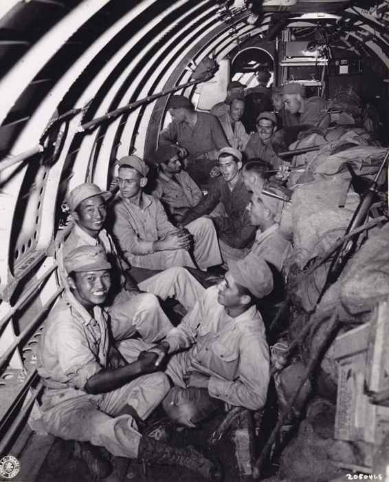 美军联络官、官兵们在缅甸与中国军队并肩作战两年多后,随中国军队从缅甸飞越“驼峰”前往中国。他们在旅途中的情绪都很放松。