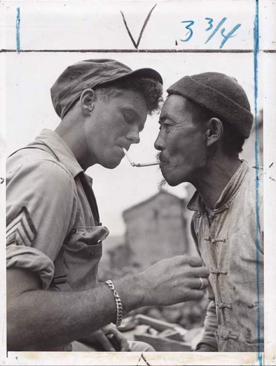 一位年长的中国男人在满目疮痍的腾冲街头停下脚步,向一名美军军士借火,点燃他的烟。美国军人也为把日本人驱赶出这座古城尽了一份力。五周的浴血奋战以卫立煌将军率领的中国远征军的胜利告终,这位耐心的玉石之都居民便挑着装着他所剩无几的家当的篮子回到了被焚毁的城里。图片中的美军隶属于Y部队作战指挥部,他们协助中国远征军打下了这场胜仗。