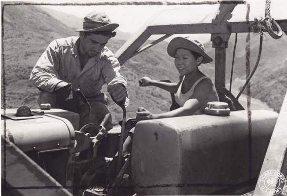 路易斯安那州的内森·伯瑞吉五级技术军士是Y部队作战指挥部的工程师兼推土机手,参与修建滇缅公路。他正在向一个名叫明克的心灵手巧中国小男孩示范如何操作机器。