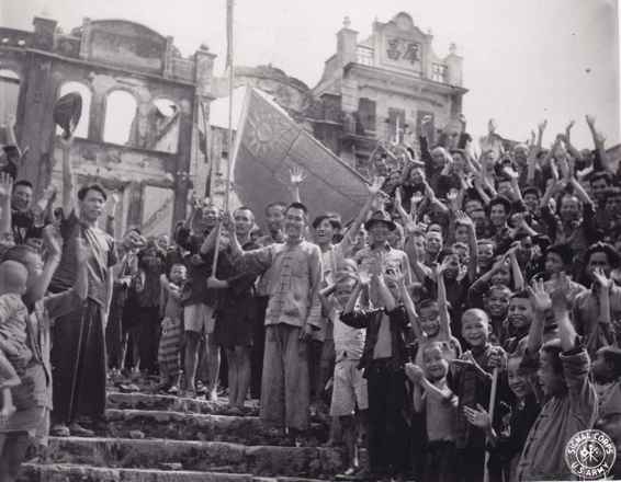 民众向通信部队的摄影师欢呼致意。他们是第一批与中国胜利部队入驻空军基地的美军。