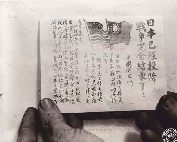 Photo of the leaflets that were dropped on the Chinese in the Jap occupied territories after the Jap surrender.