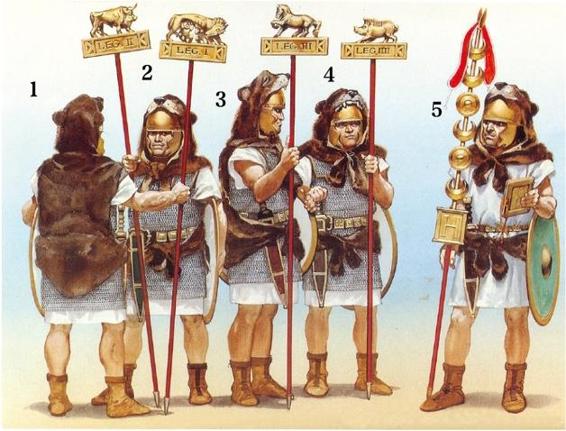 ◎ 罗马起初四大军团的徽标。狼、野猪、公牛和骏马是罗马共和国初期的象征,并被用来作为军团鹰旗的徽标。图中1234为城市军团的旗手,5为青年兵步兵中队的中队旗手。