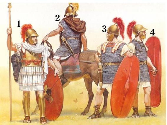 ◎ 公元前2世纪尾声的共和国军团,锁甲已在这一时期成为军团的标准配备。图中1为护民官,2为骑士,34为步兵战士。