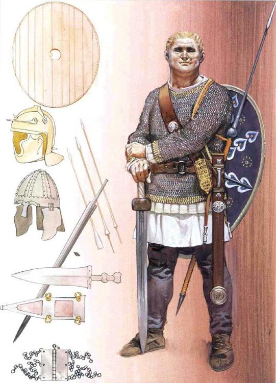 ◎ 公元3世纪中后期的军团士兵。帝国末期的军团士兵,其装备和战法与其蛮族对手越来越相似,军团本身已成为由蛮族组成的军队。