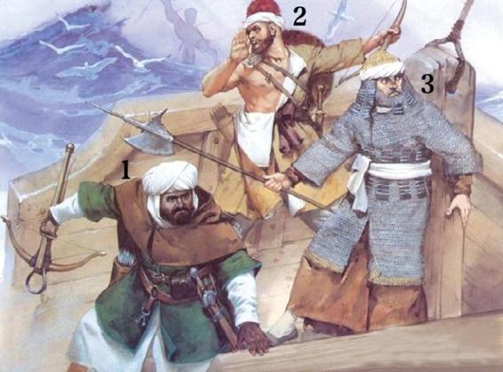 ◎ 马穆鲁克王朝的步兵和海军(1400-1450)。1为马格里布水兵,2为自由民步兵,3为埃及海军军官。