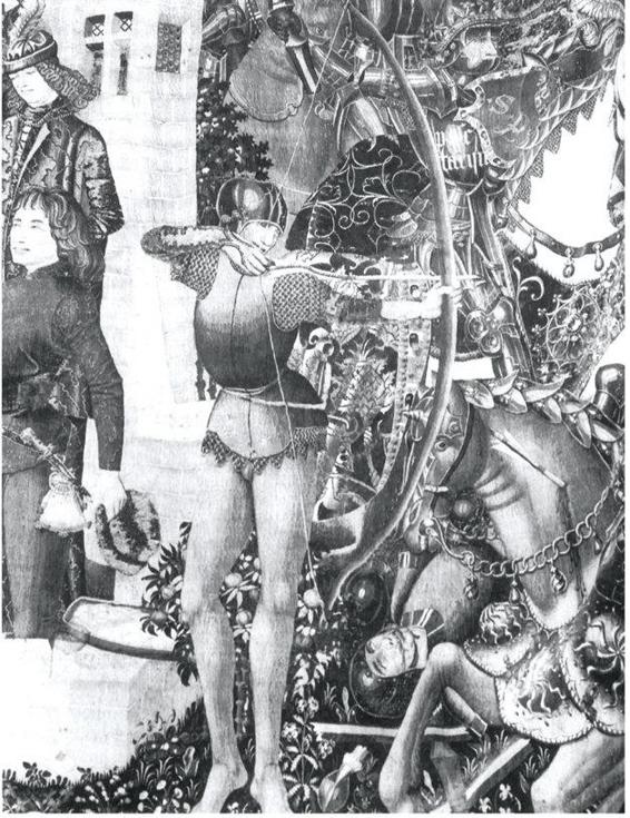 ◎ 一名持弓的英格兰长弓手。画中同时可见被描绘的倒下的法国骑士。
