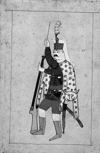 ◎ 普通的加尼沙里士兵,注意他头戴的白色软帽后沿的下垂和前沿的木勺型帽徽。后者代表了军团对伙食供应的重视。